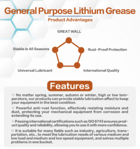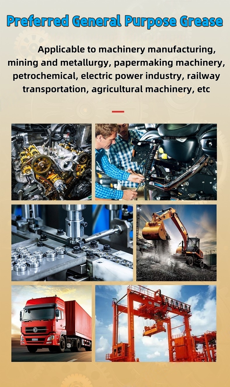 This lithium base grease stands out for its balanced mechanical stability, oxidative resistance, and high-temperature performance, making it suitable for both light-duty and heavy-duty industrial environments. Whether used in automotive bearings, electric motor housings, construction equipment, metallurgical machinery, agricultural tools, or general plant lubrication points, the formulation ensures long-lasting protection and lubrication reliability.