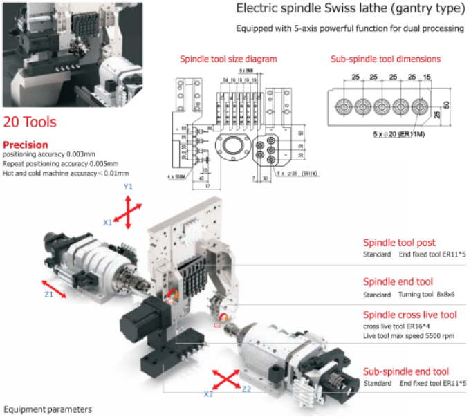 The machine’s tooling configuration includes 6 turning tools (8×8 mm), 4 side live tools (ER11), 5 spindle-end ER11 tools, and 5 sub-spindle end ER11 tools. Live tooling speed reaches 5000 r/min, supporting powerful drilling and tapping functions on all axes.