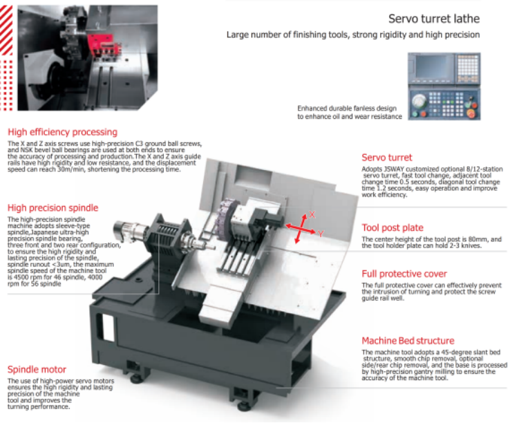 The lathe features a JSWAY-customized servo turret with optional 8-station or 12-station configurations.