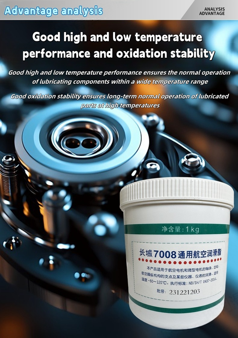 Aviation Grease 7008, positioned as a high-quality aviation and industrial lubricant, is formulated using synthetic base oils thickened with a complex soap agent, along with structural stabilizers and antioxidant additives. This composition provides a balanced combination of high-temperature resistance, low-temperature fluidity, and mechanical stability under heavy loads and high-speed operation.