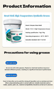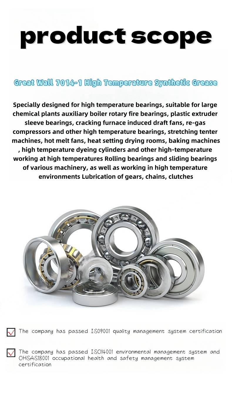 With its combination of high heat resistance, oxidation stability, anti-wear performance, mechanical durability, and long service life, 7014-1 High-Temperature Grease is a trusted solution for industries requiring reliable lubrication in the harshest working conditions. It ensures maximum equipment protection, improved operational efficiency, and long-term dependability—making it one of the best choices for high-temperature industrial lubrication.